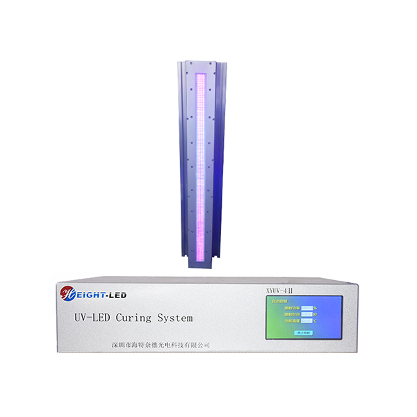 This is a high-performance leduv surface light source curing system, which mainly includes a controller, UVLED irradiation head and connecting wires. The UVLED irradiation head is integrated with imported high-intensity ultraviolet LEDs. The UV spectrum wavelength is 365nm, and it uses forced air cooling. The effective curing area is 600X20mm. It supports external signal input and triggering. It can be equipped with semi-automatic or fully automatic production lines.